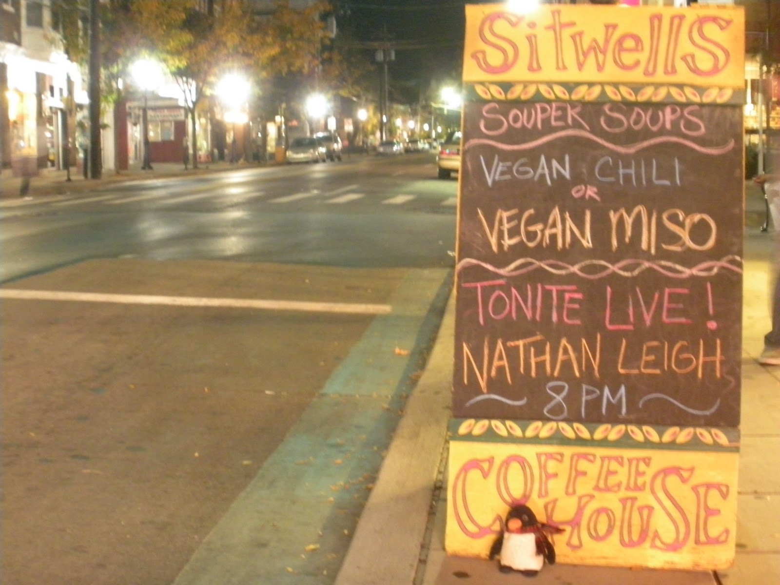 The drive across Pennsylvania was long and dull. I'm still captivated by corn fields and train yards, but highways through mountains just don't do it for me anymore. I've moved on to stronger stuff. I pulled in to Pittsburgh with half an hour before the show was supposed to start and walked into the empty coffee shop. I was a little concerned, but Nathan and Ben who ran the place assured me that there were people coming and it would be a fun night. Also they spelled my name wrong on the placard outside. So I had a fresh zucchini panini (which is fun to say) and chatted with them for a bit before getting set up. This is Pen Pen in front of the side of the placard where they spelled my name right because I promised I wouldn't post pictures of the other side.